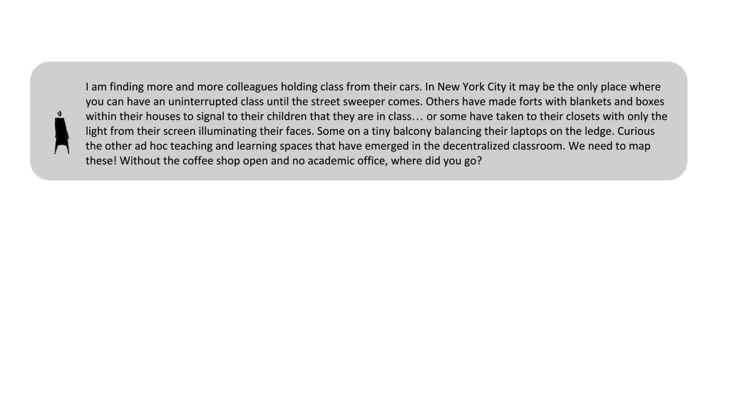 Auto-ethnographic conversations by authors during Covid, and architectural education online: