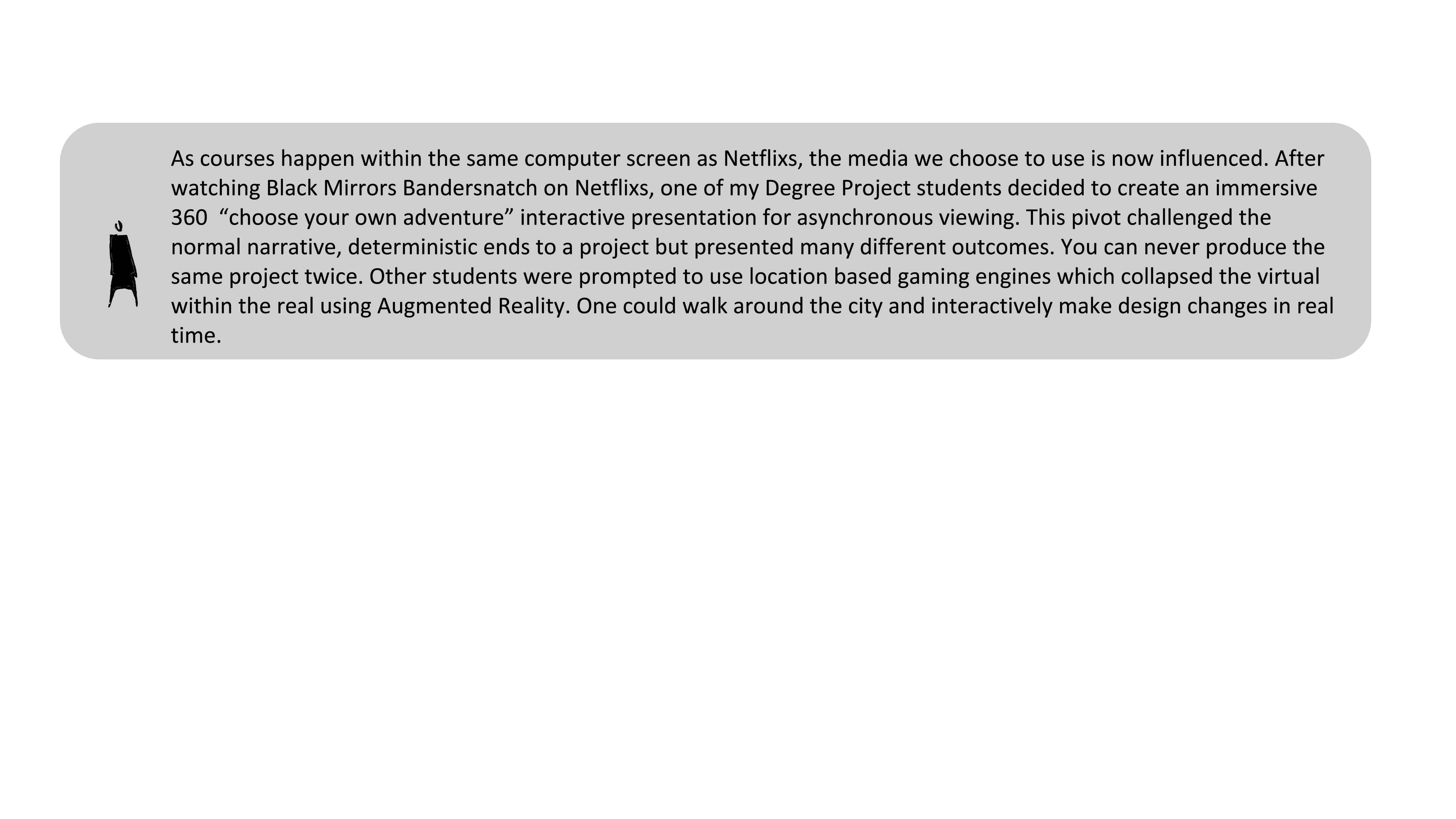 What is your perspective on the future of education that incorporates both in-person and virtual methods, and how will it address the creative space that has traditionally been a crucial component of design processes and has been successfully provided by virtual methods ( cultural context, circumstances, and individual experiences)?