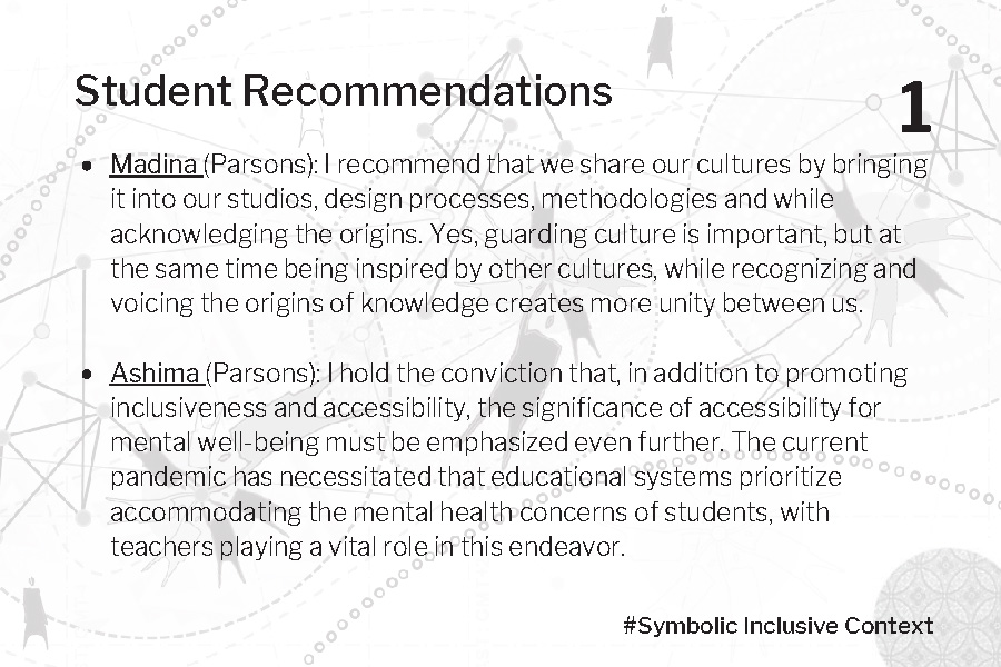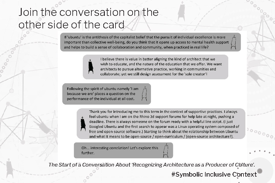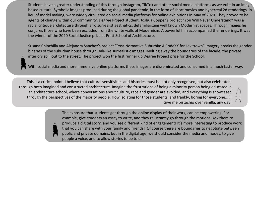 Within our pivot to remote learning, in the midst of the context of the mass protests in the USA, the symbolic dimension was heightened through the form of globally shared resources and symbolic messaging. Initial symbolic messages from institution leaders, copy/pasted responses in support of #BLM, were seen as empty words from ivory towers. The need to acknowledge and redress racism of the past and present within architectural education and the profession must be prioritized.