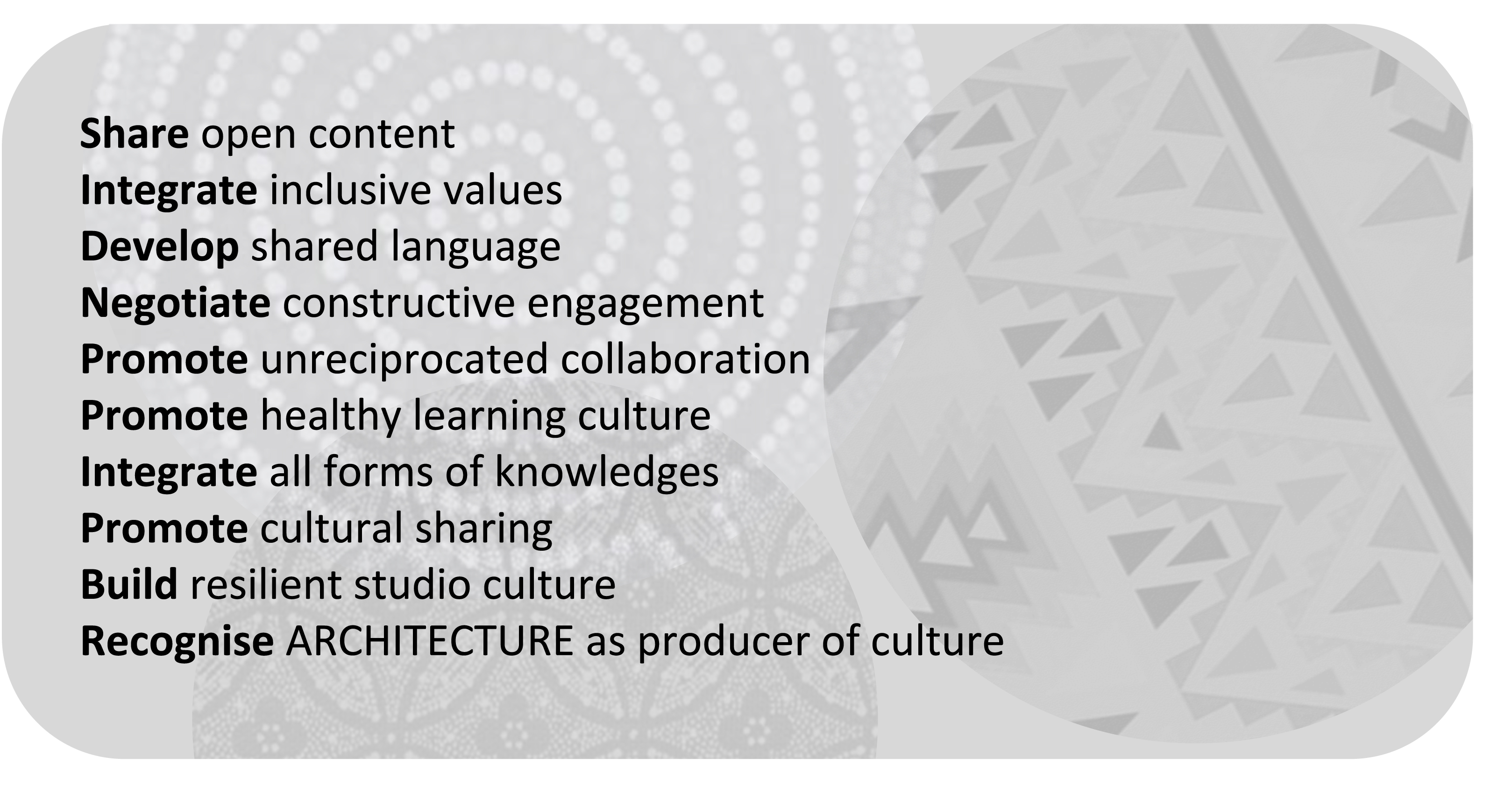 In these cultural exchanges, we acknowledged a common need to build a more resilient studio culture and promote a healthy learning culture within the architecture studio, to become more inclusive.