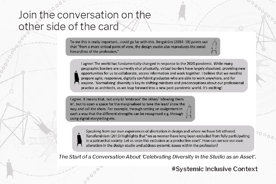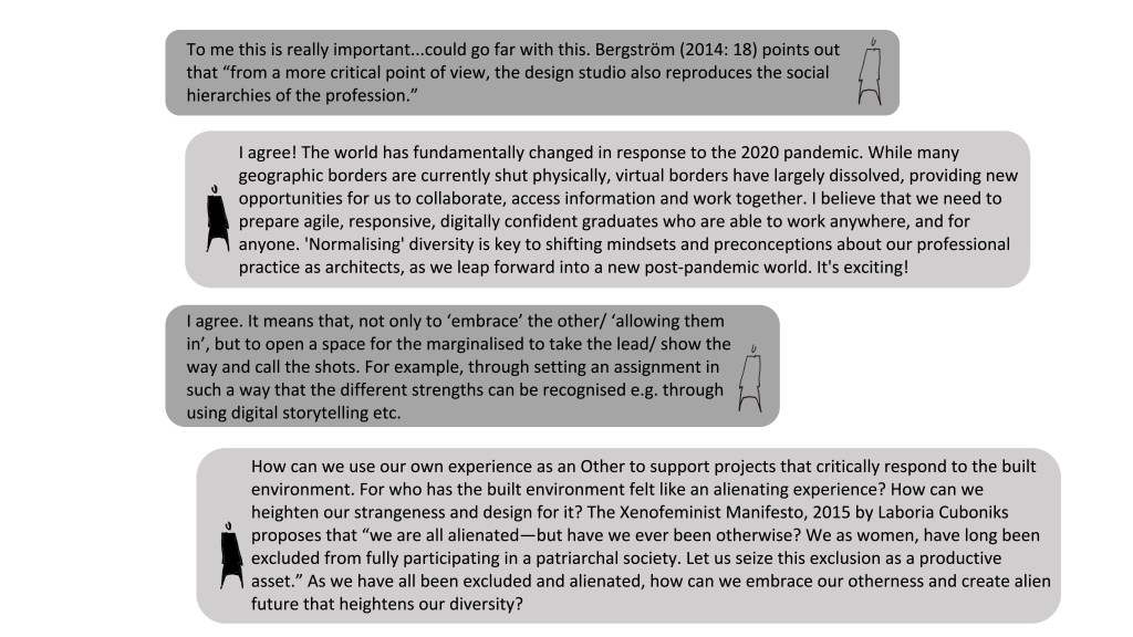 As it was easier to invite and incorporate a more diverse list of global participants within our final architectural presentations and online discussions, we were able to celebrate and bring a diversity of ideas and cultural knowledges (ACSA: Educating in a Rapidly Changing Time, 2020).
