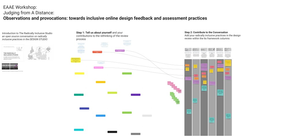 In the ‘Judging from a Distance’ workshop, we employed a methodology of inclusivity by inviting workshop participants to contribute to the discussion, prompted by our own shared observations. Their inputs were provided through the chat and by recording verbal comments and written thoughts in a collective Miro (white) board.