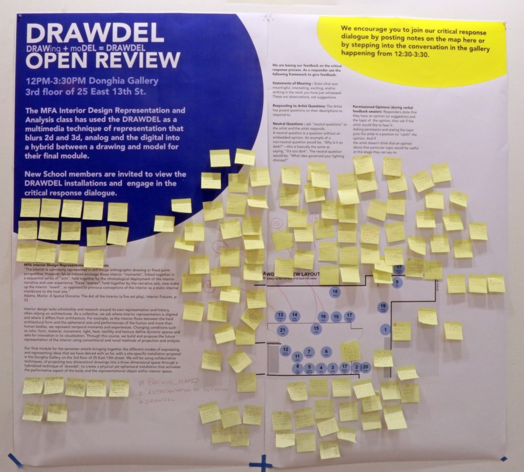 For the final module students created a hybrid between drawing and a model at an installation scale. The final review was set up as an exhibition that was open to visitors outside of the classroom. There was time during class to exchanged ideas and feedback conversationally about each of the student’s projects. A sticky note system was set up so written feedback could be captured in a written manner as students were presenting. Seeing the student work come together for an exhibition of their explorations was a rewarding finale to the semester.