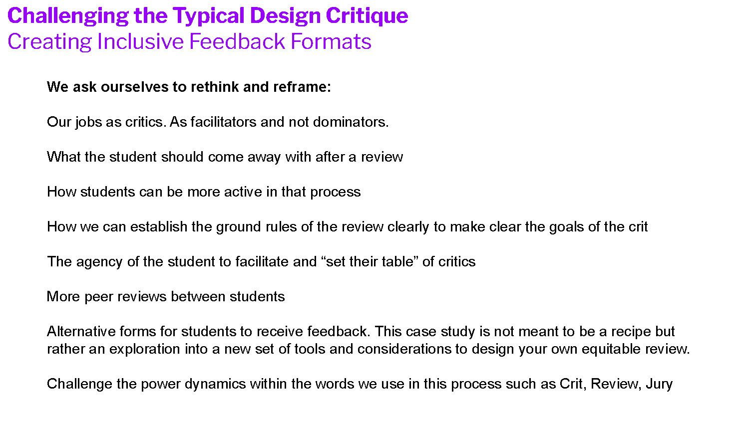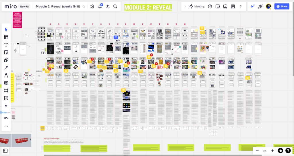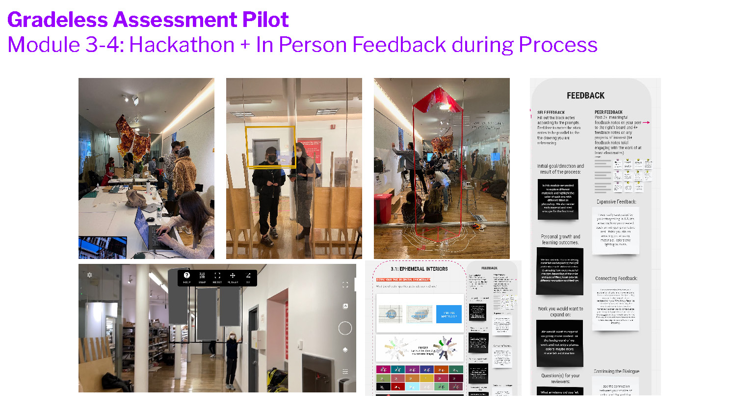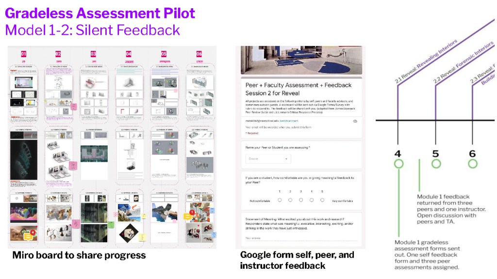 To track the progress of the class a digital pinup board, Miro, was used for each module. The feedback was collected with specific prompts through google forms. Feedback from both peers and instructors were posted below the student work on the class Miro board. The feedback was given anonymously after the TA went through the feedback to flag for feedback that was not appropriate or had micro aggressions. Self feedback forms were submitted, and we had modules where the self feedback was public for reviewers to reference on Miro and other modules which where self feedback was private.