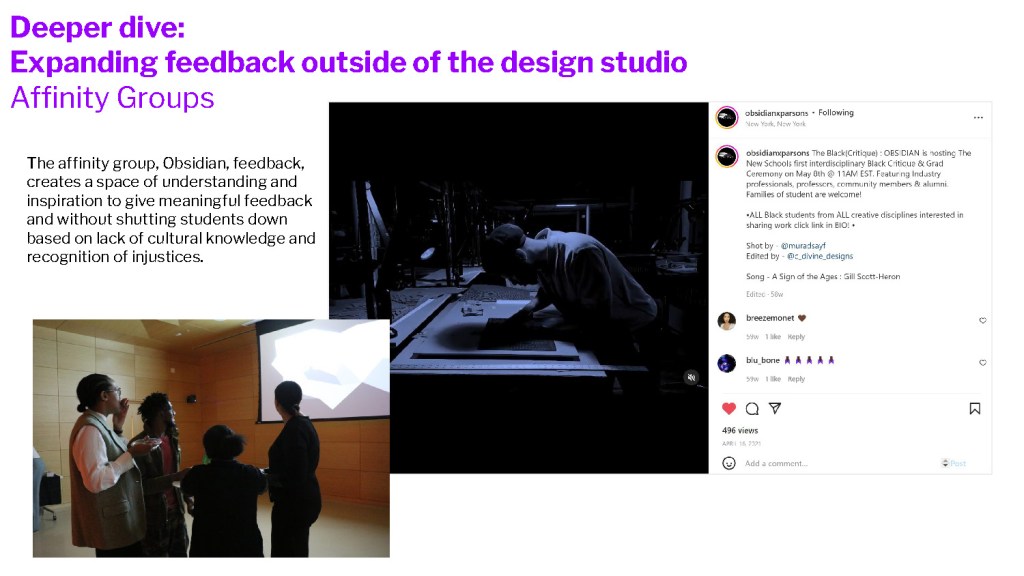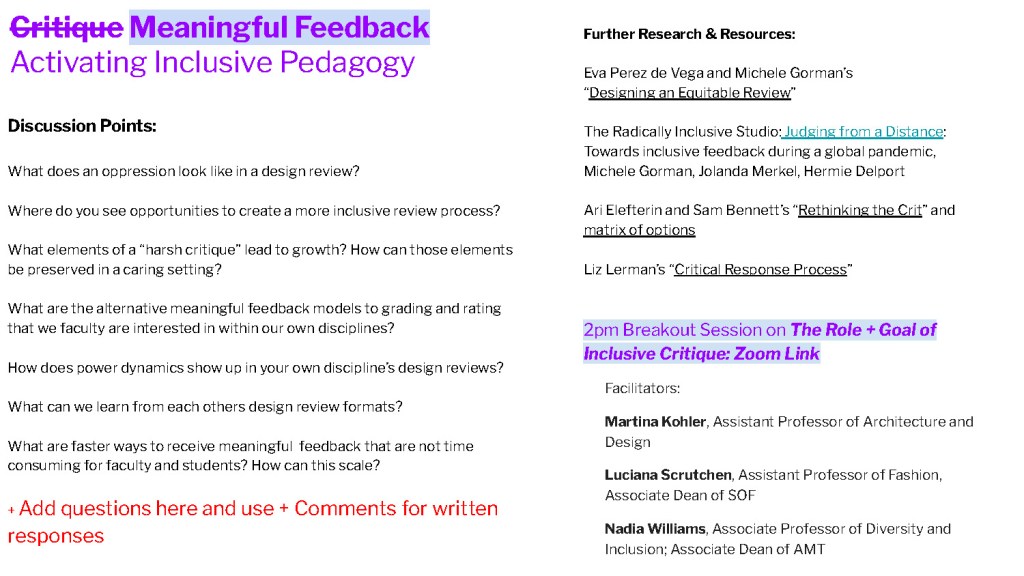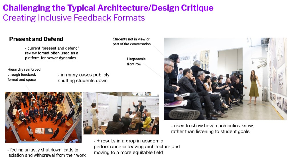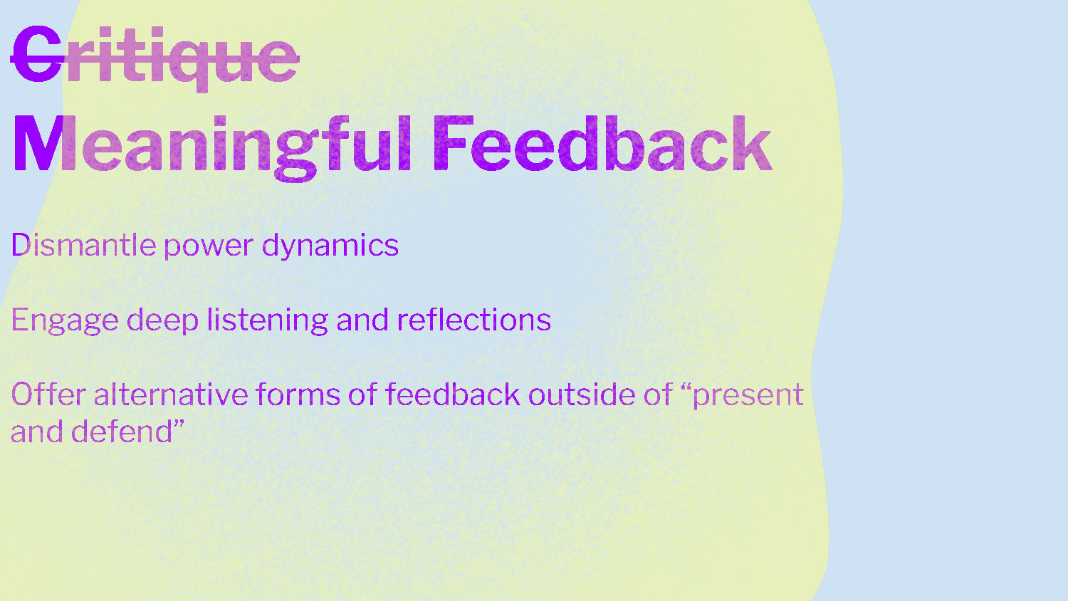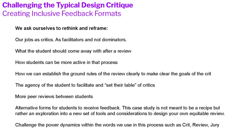 To track the progress of the class a digital pinup board, Miro, was used for each module. The feedback was collected with specific prompts through google forms. Feedback from both peers and instructors were posted below the student work on the class Miro board. The feedback was given anonymously after the TA went through the feedback to flag for feedback that was not appropriate or had micro aggressions. Self feedback forms were submitted, and we had modules where the self feedback was public for reviewers to reference on Miro and other modules which where self feedback was private.