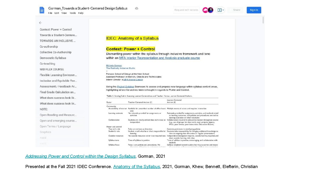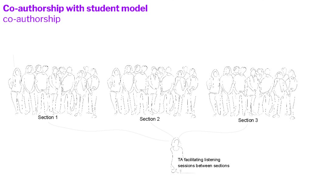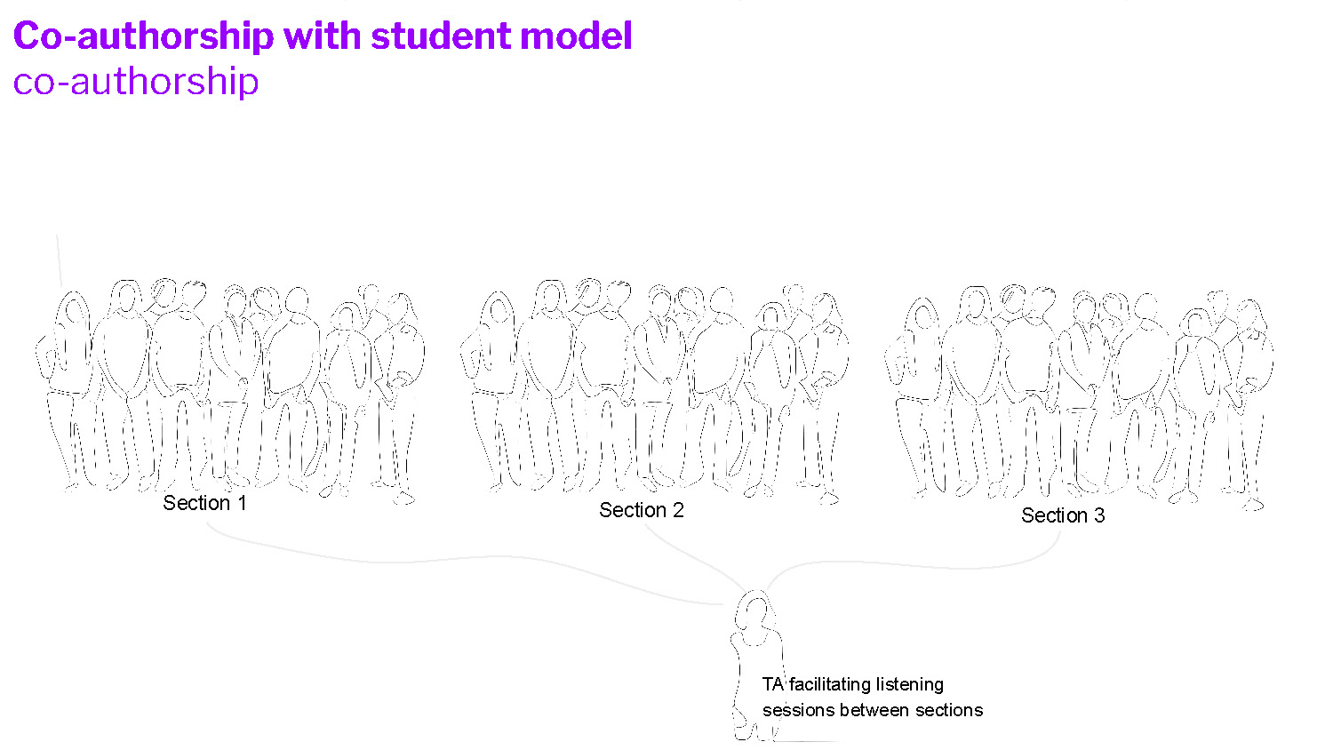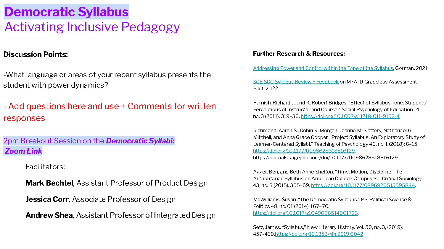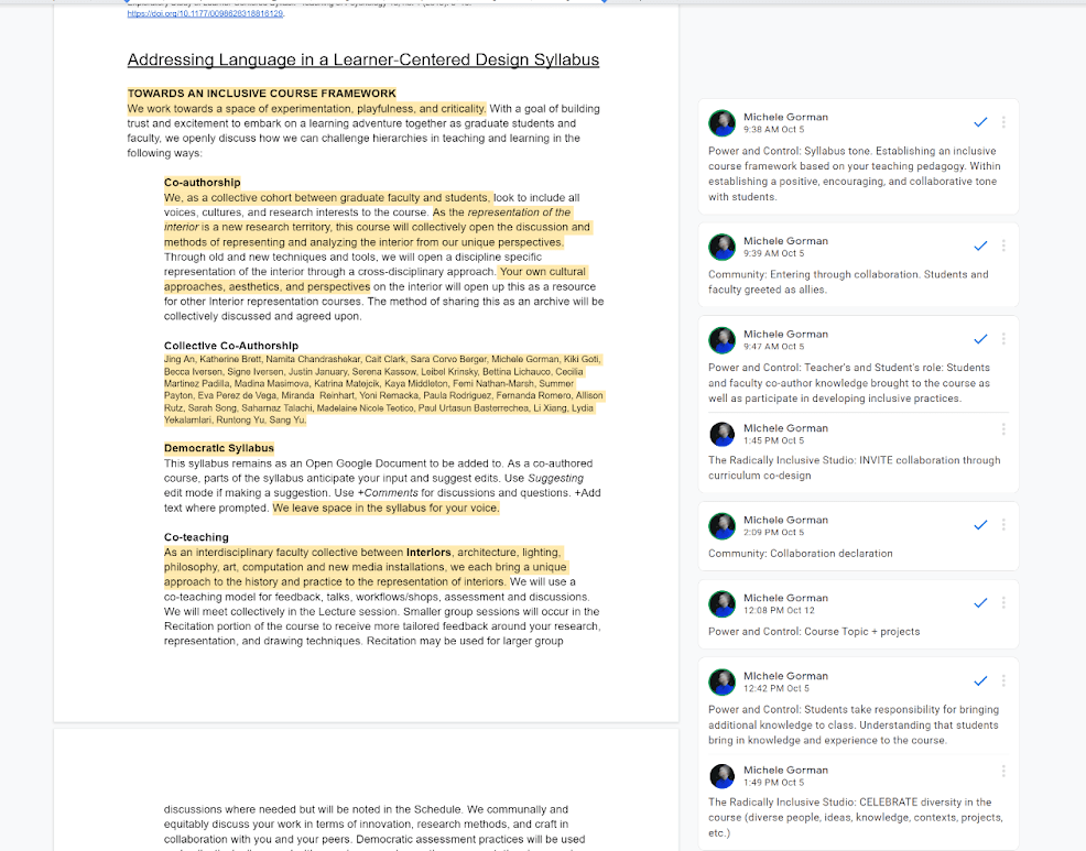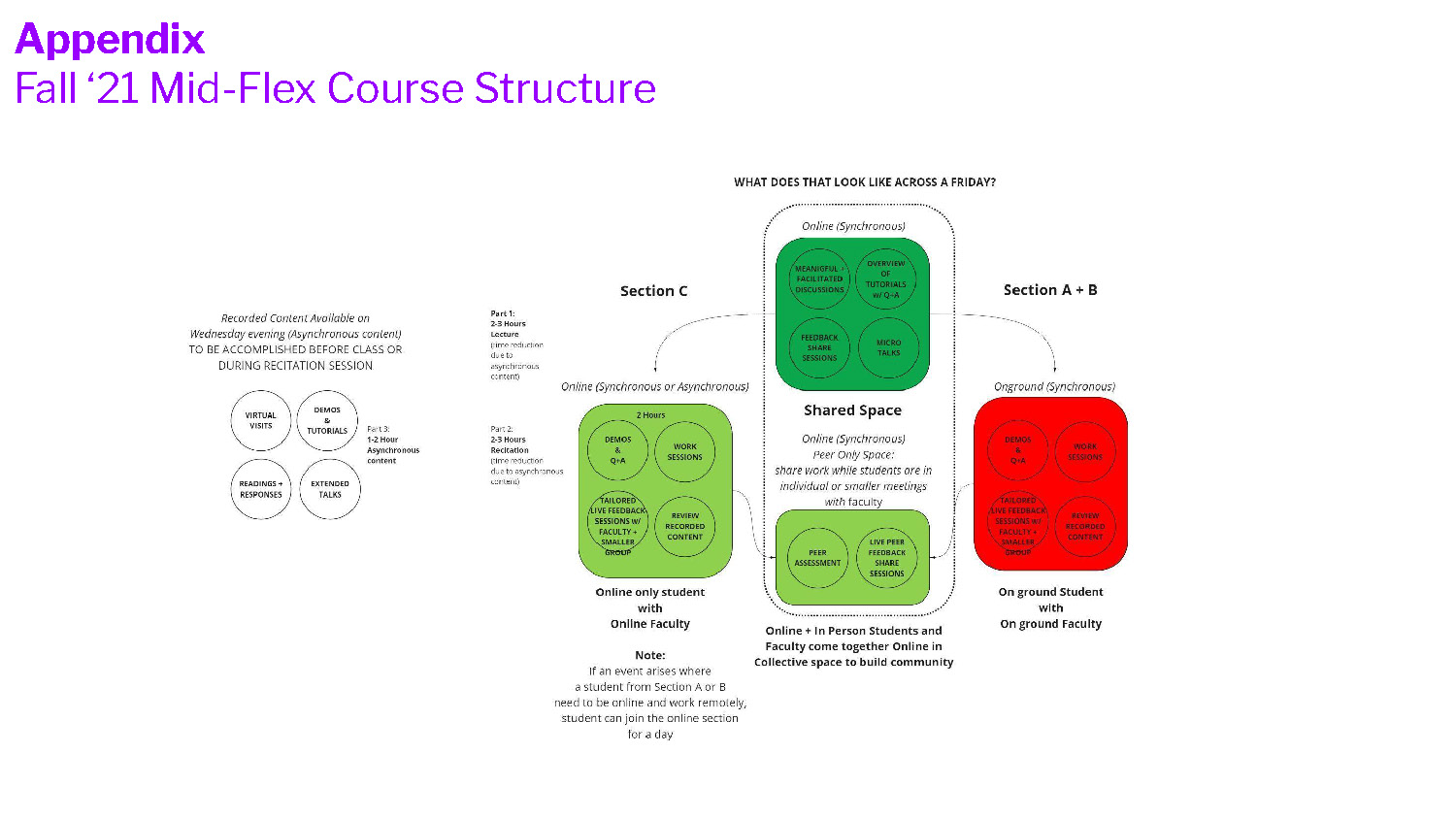The course was taught with a hybrid of remote and in person learning. Three instructors and one student teaching assistant guided 28 students through the curriculum. Each instructor was able to focus on a section of the class and the teaching assistant coordinated the feedback sessions. The instructors used the syllabus as a platform for student voices and set an inclusive tone for the class by welcoming comments and feedback on the google document.