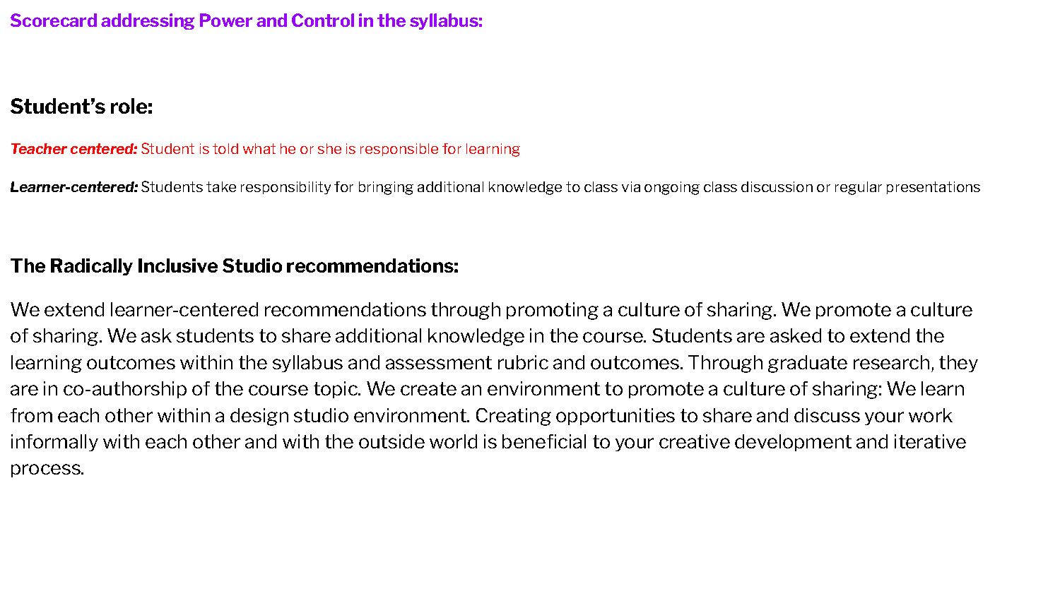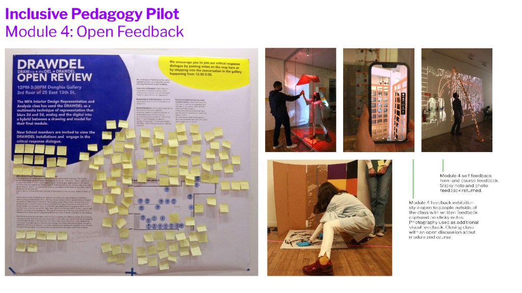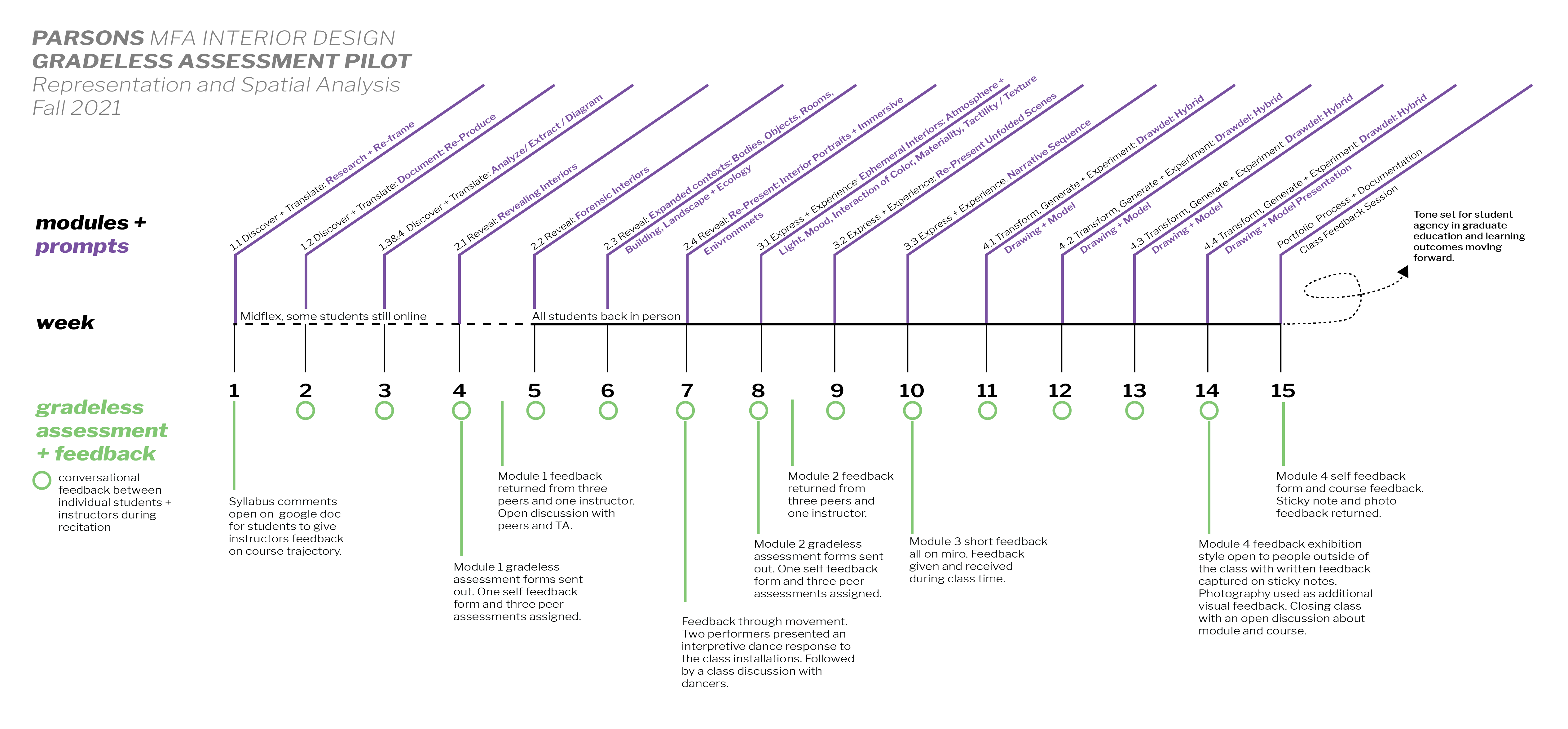 The MFA Interior Design’s Representation and Spatial Analysis class integrated inclusive feedback practices throughout the 15 week course. At four feedback sessions in the semester, students submitted an assessment portfolio based on the course outcomes. During each feedback session, students assessed themselves based on the collective assessments and decided how to iterate the project. Faculty and students met individually to discuss the assessments, accomplishments, and any discrepancies regarding course outcomes. The feedback sessions were iterative to adapt to the class reactions and specific module learning outcomes.