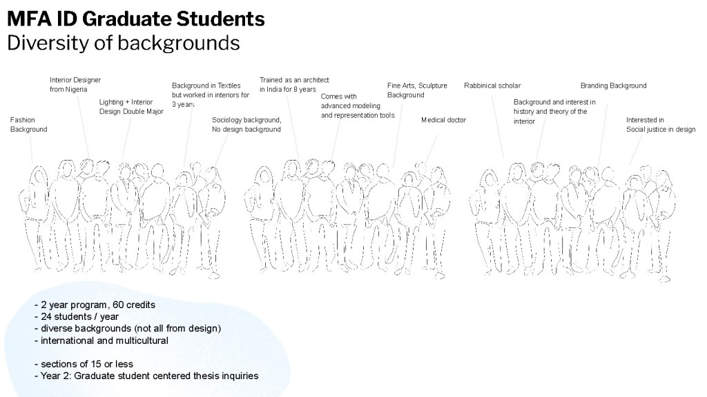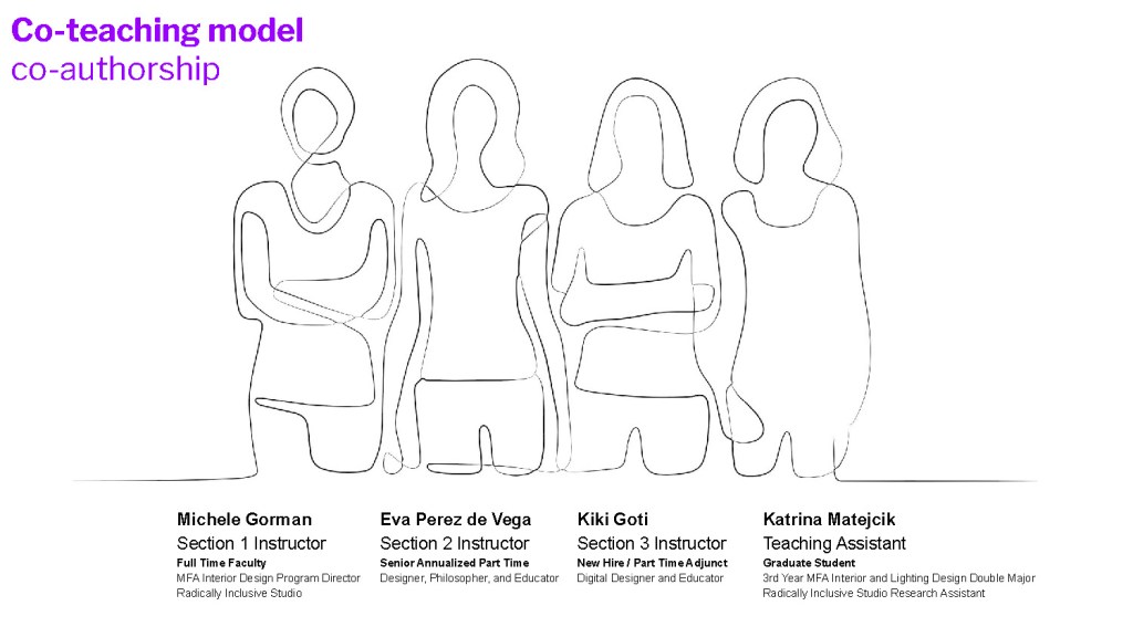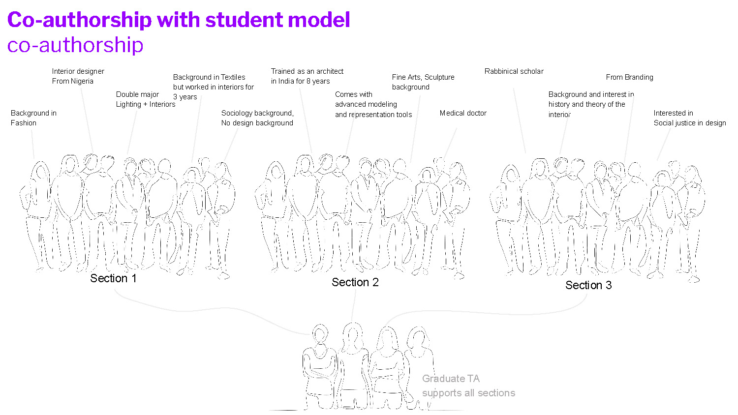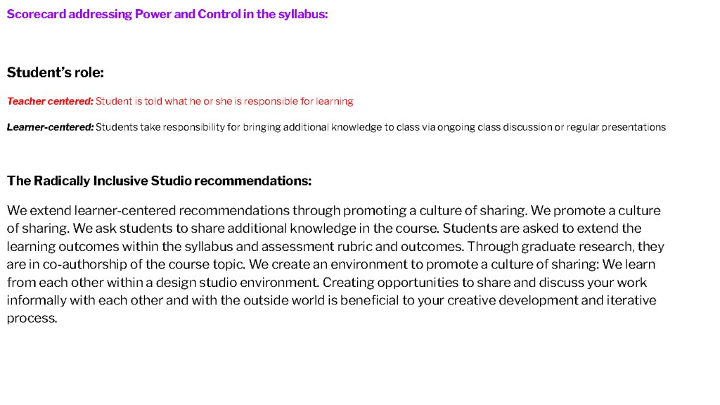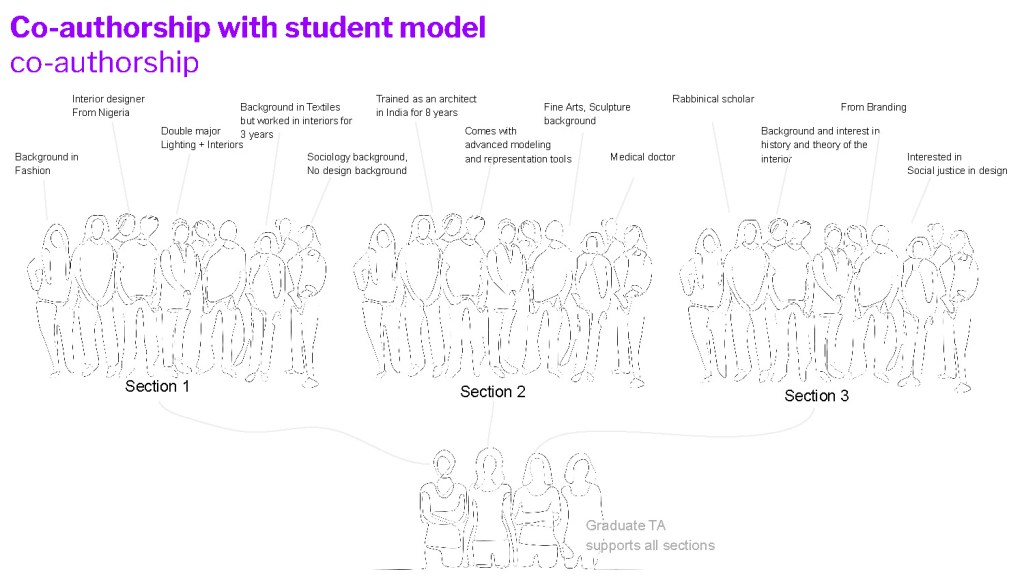 The MFA Interior Design’s Representation and Spatial Analysis class integrated inclusive feedback practices throughout the 15 week course. At four feedback sessions in the semester, students submitted an assessment portfolio based on the course outcomes. During each feedback session, students assessed themselves based on the collective assessments and decided how to iterate the project. Faculty and students met individually to discuss the assessments, accomplishments, and any discrepancies regarding course outcomes. The feedback sessions were iterative to adapt to the class reactions and specific module learning outcomes.
