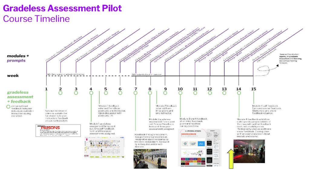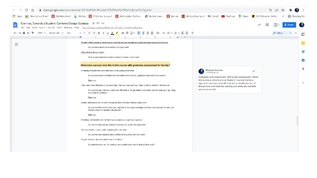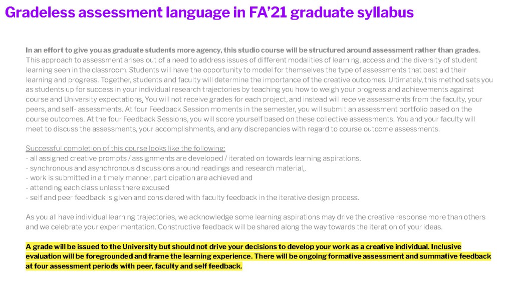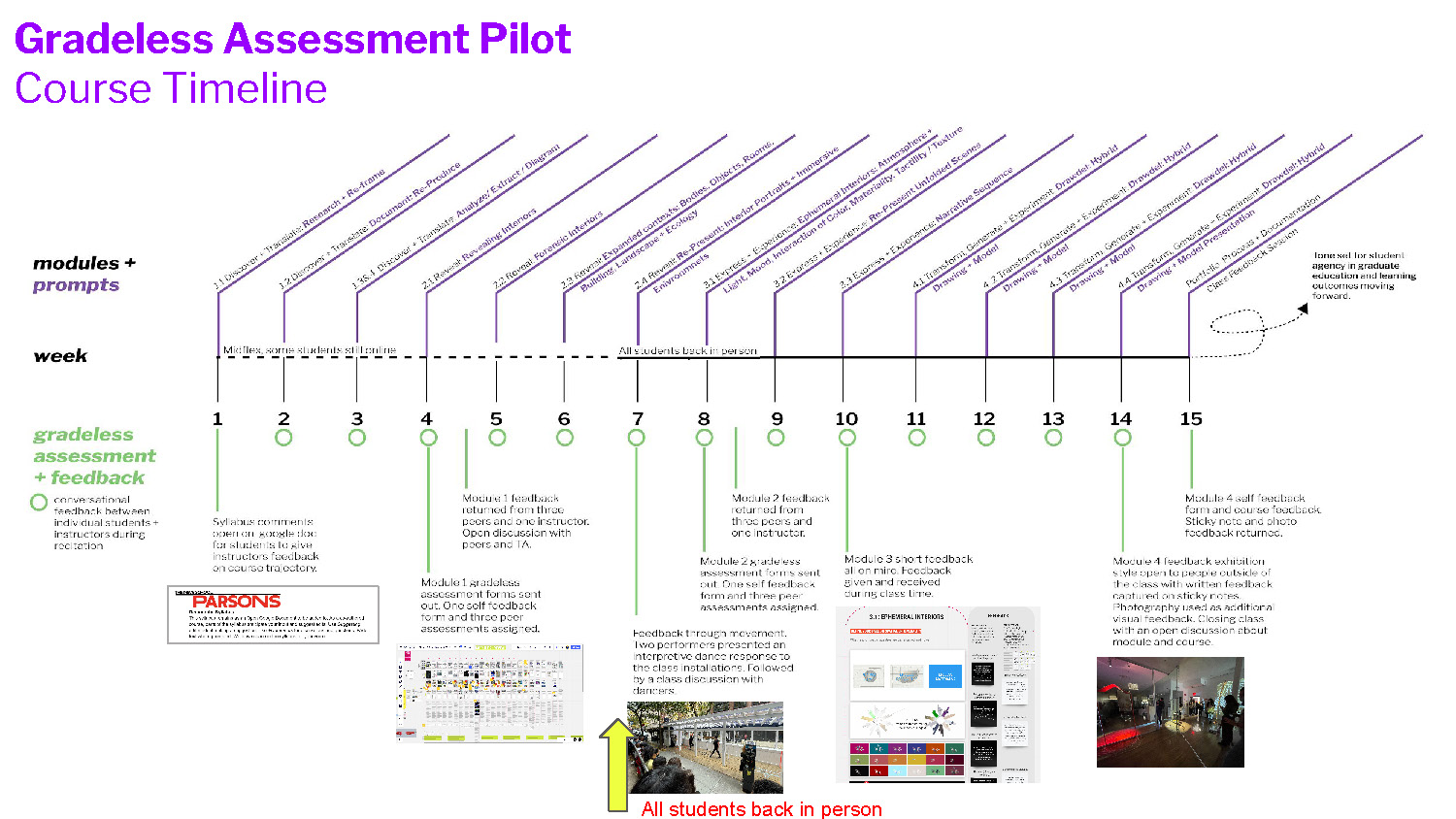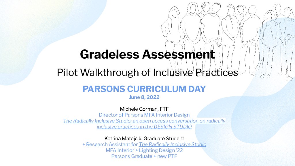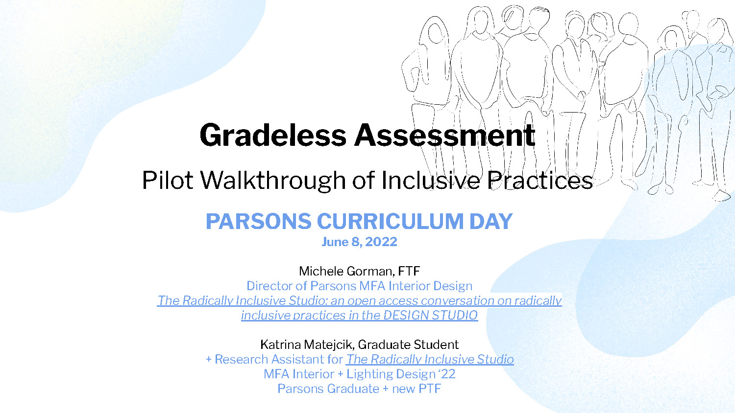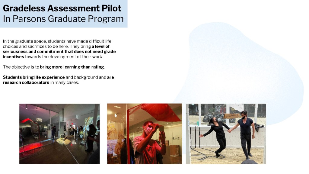 If you would like to know more details about the process and conclusions from the gradeless assessment pilot, feel free to reach out directly to Michele Gorman gormanm@newschool.edu and Research Assistant Katrina Matejcik, matek062@newschool.edu.