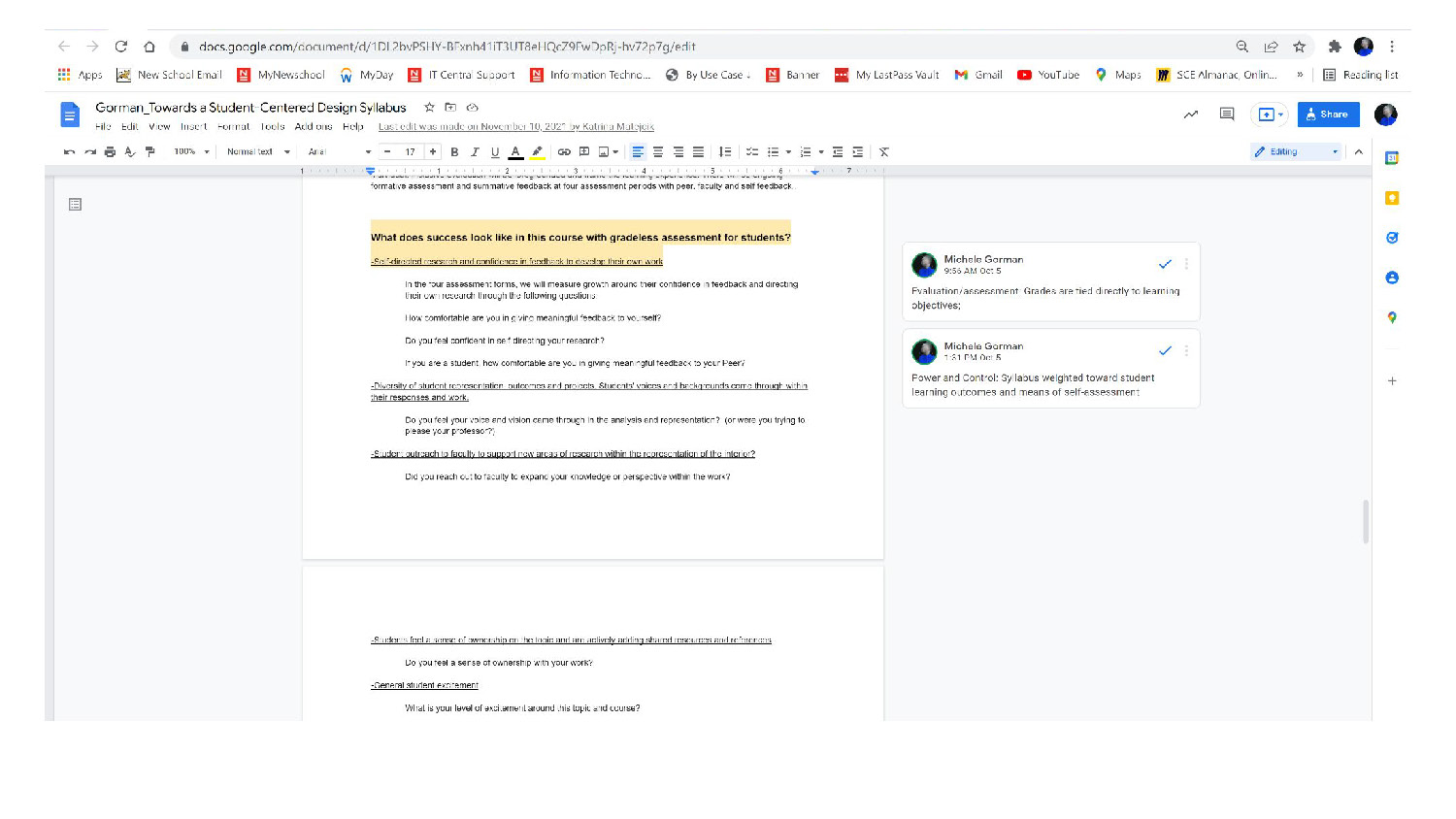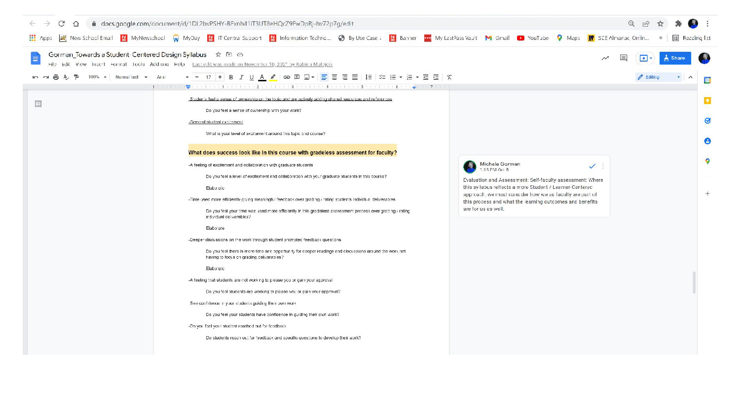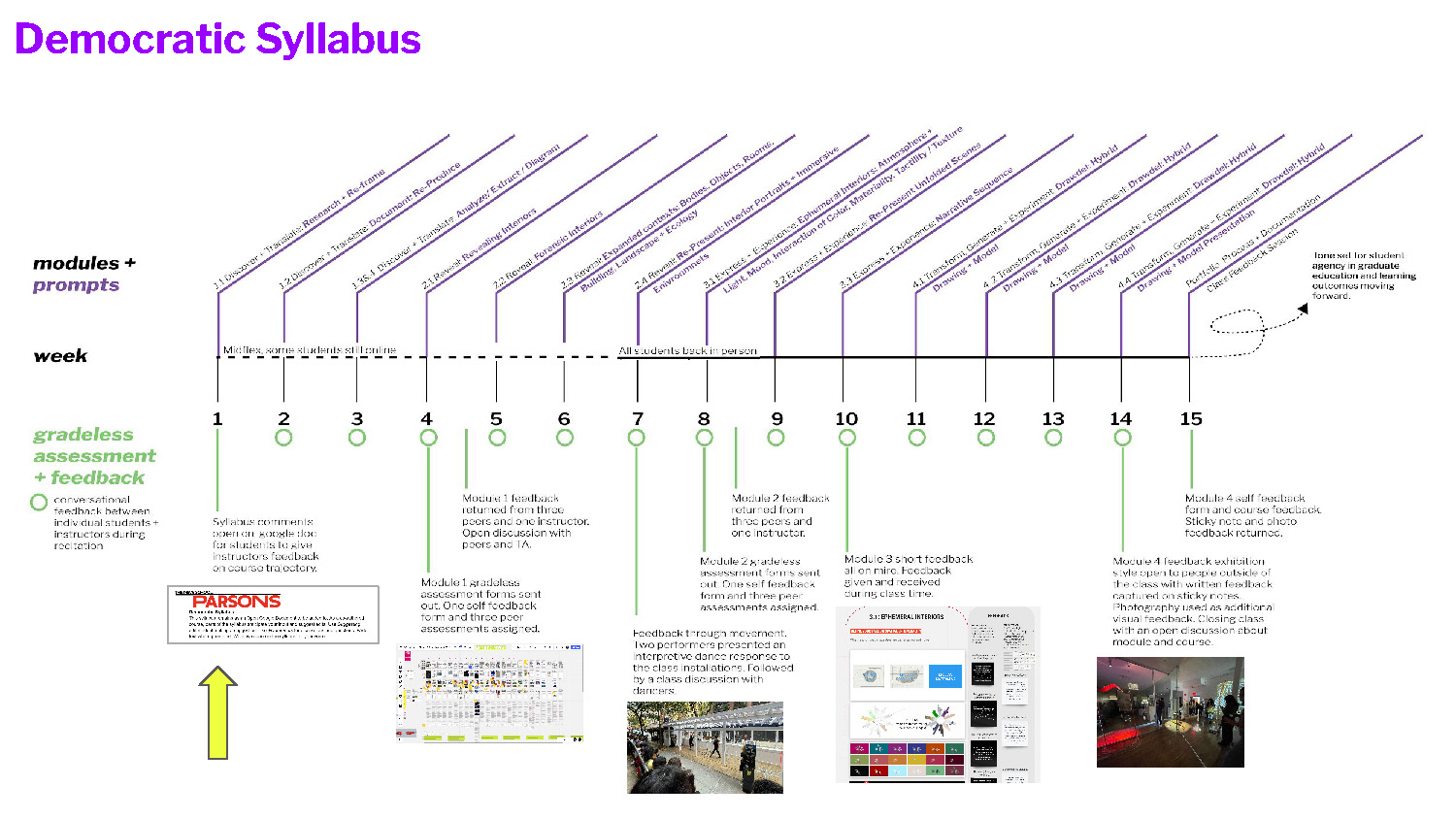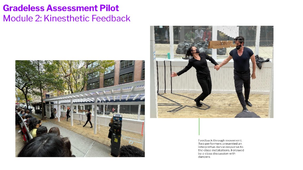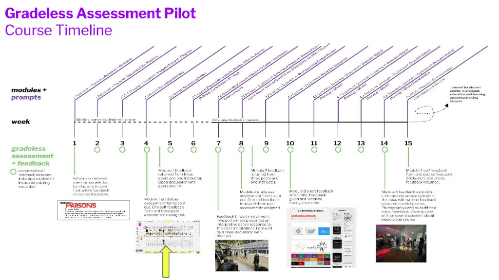 If you would like to know more details about the process and conclusions from the gradeless assessment pilot, feel free to reach out directly to Michele Gorman gormanm@newschool.edu and Research Assistant Katrina Matejcik, matek062@newschool.edu.