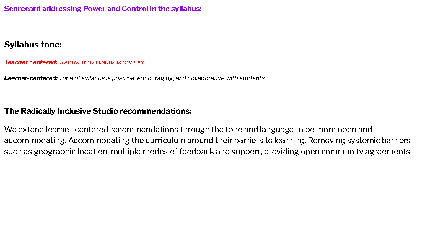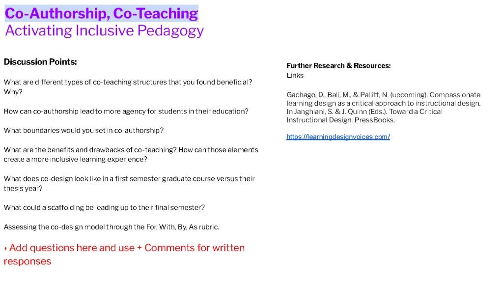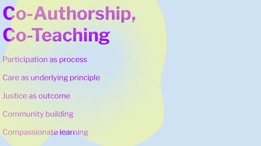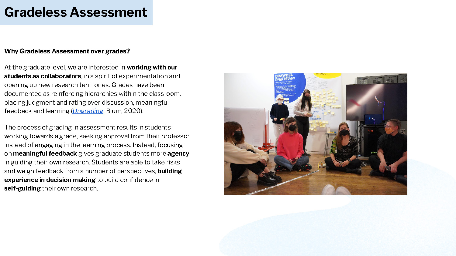 At the graduate level, we are interested in working with our students as collaborators, in a spirit of experimentation and opening up new research territories. Grades have been documented as reinforcing hierarchies within the classroom, placing judgment and rating over discussion, meaningful feedback and learning (Ungrading; Blum, 2020). The process of grading in assessment results in students working towards a grade, seeking approval from their professor instead of engaging in the learning process. Instead, focusing on meaningful feedback gives graduate students more agency in guiding their own research. Students are able to take risks and weigh feedback from a number of perspectives, building experience in decision making to build confidence in self-guiding their own research.