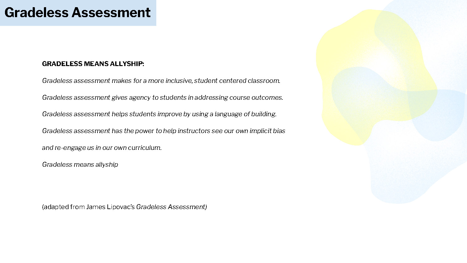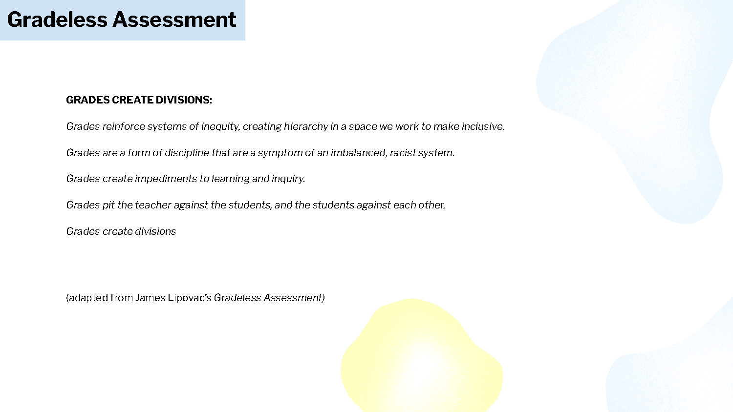 Gradeless assessment is not a system, but an extension of an individual’s pedagogy. Gradeless assessment will look different for different types of teaching practices. Going gradeless is a practice of giving away power.