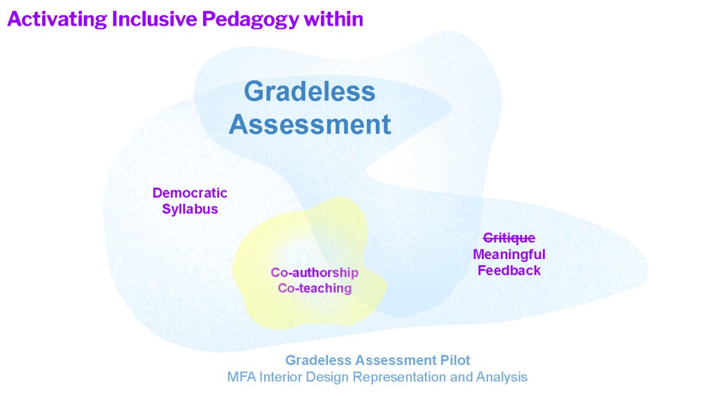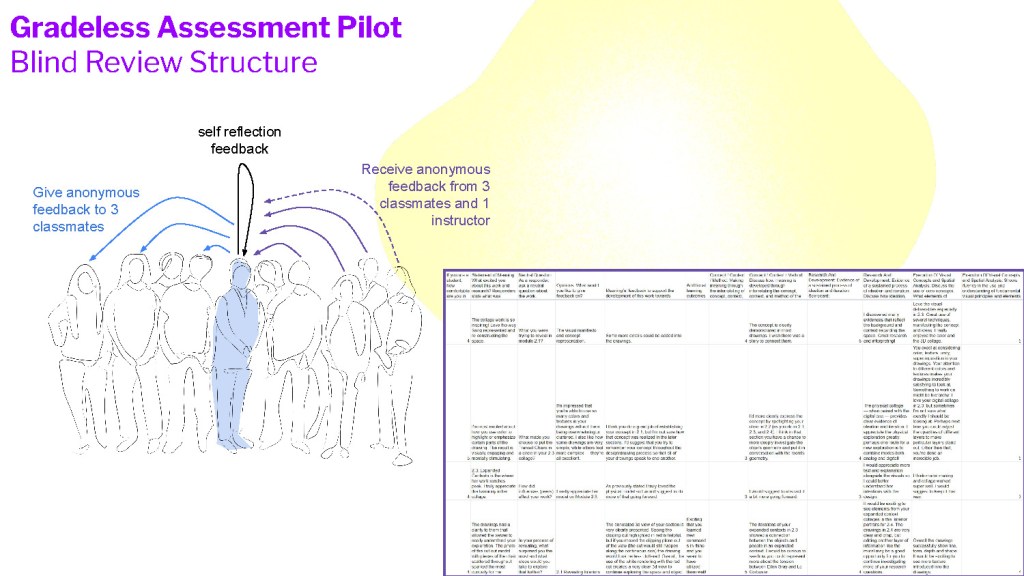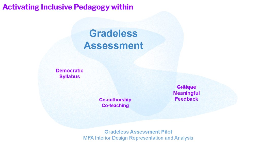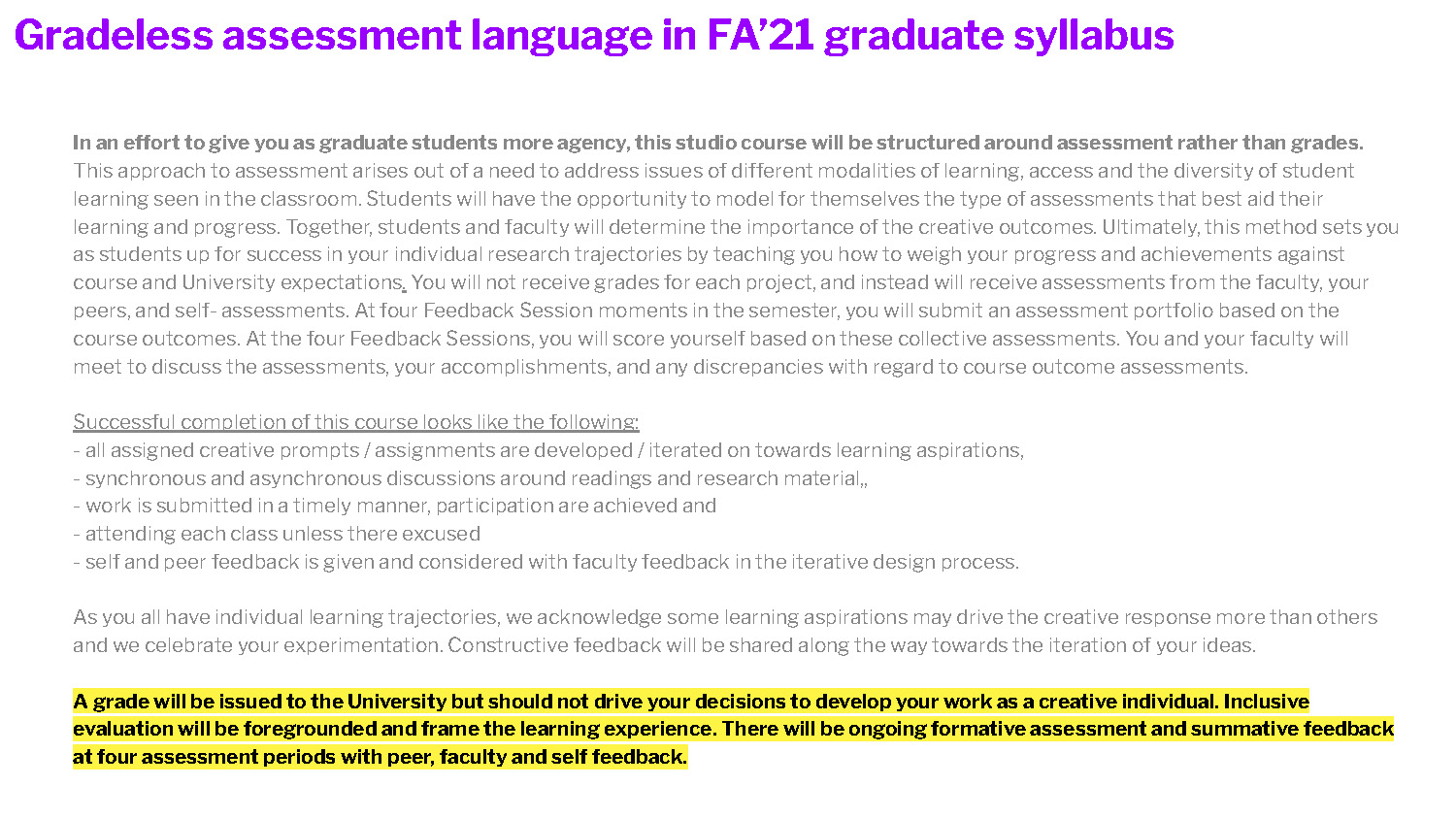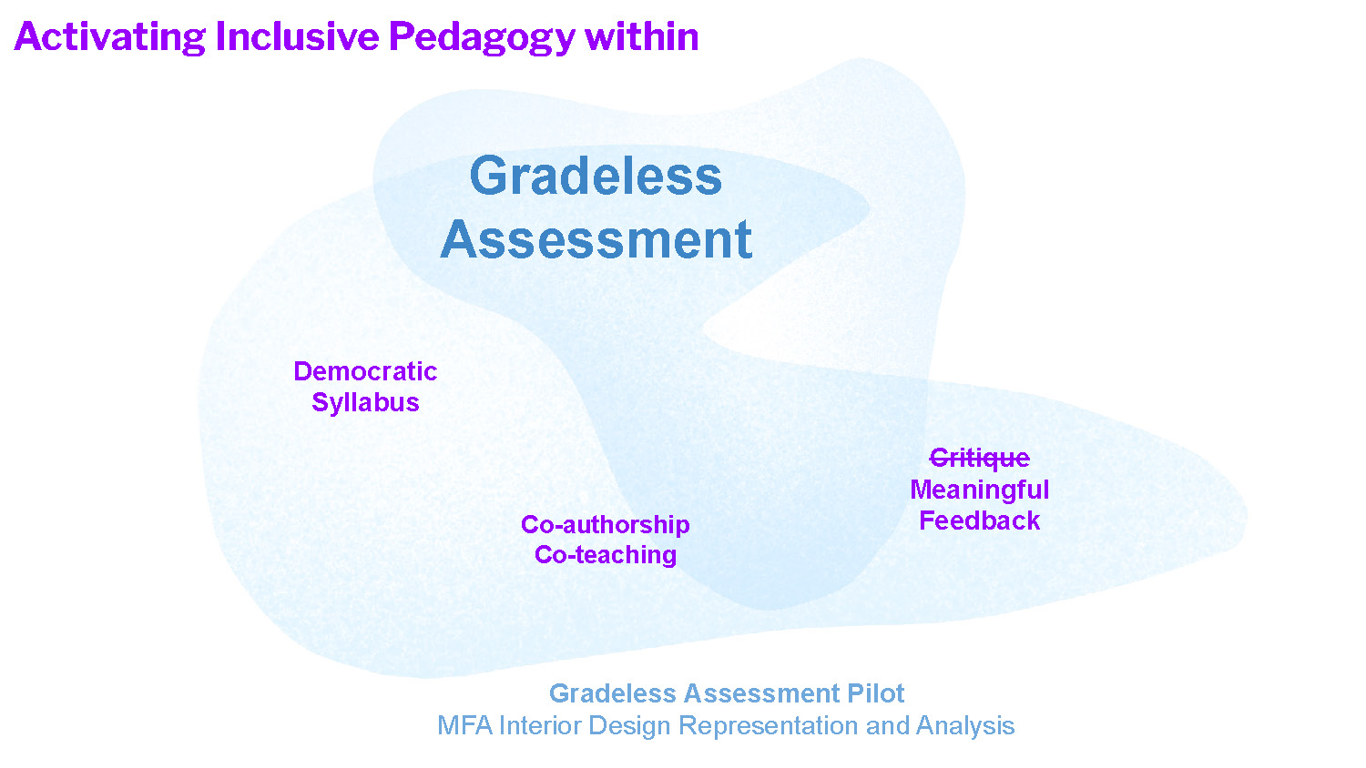We offer an example of a gradeless assessment process at the graduate level in Parsons piloted in MFA Interior Design’s Representation and Spatial Analysis within the first year curriculum, Fall 2021. Students in this course had the opportunity to model for themselves the type of assessments that best aid their learning and progress. Together, students and faculty determined the importance of creative outcomes. Ultimately, this method set students up for success in individual research trajectories by teaching them how to weigh progress and achievements against course and University expectations. Students did not receive grades for each project, and instead received assessments from the faculty, peers, and self-assessments. In the final assessment, we concluded that the majority of the class would want to continue using gradeless assessment, and the following semester gradeless assessment was incorporated in another required course. As students move through the two year program, the hope is to foster an inclusive academic culture and expectations to support them to freely lead their individual research.